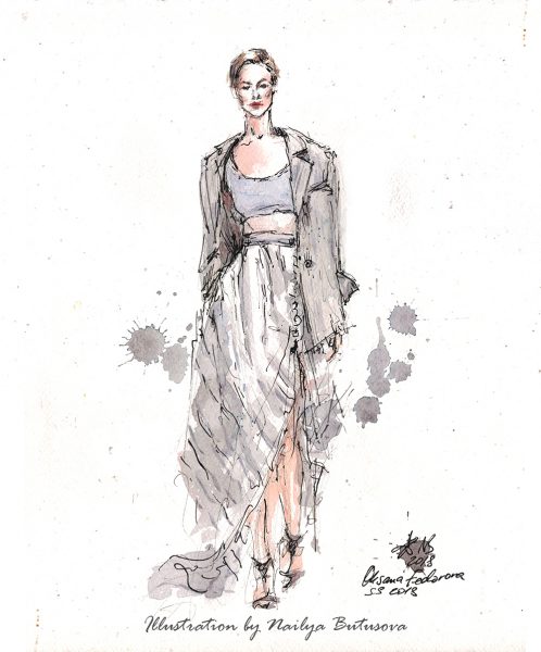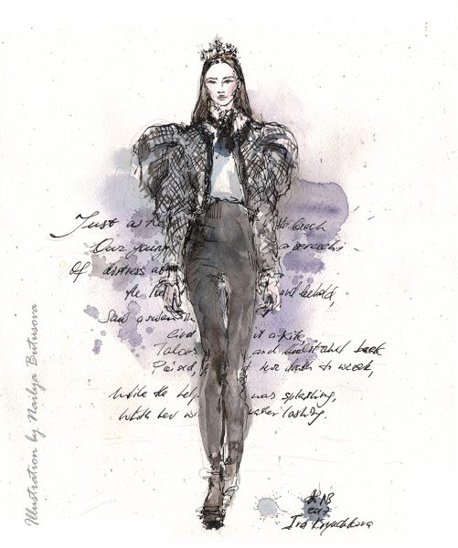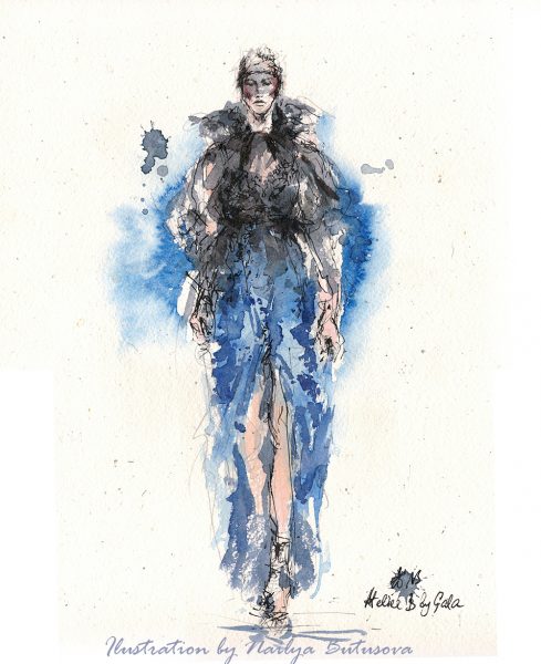 В fashion-иллюстрацию пришла постепенно по зову сердца. Очень люблю моду! Для меня это настоящее вдохновение. Несколько сезонов я посещала неделю моды в качестве гостя, но потом решила попробовать нарисовать образ с показа. Я очень хорошо это помню. Это был образ из коллекции Виктории Адреяновой «Птицы» (2013 год), и сейчас эта работа хранится у дизайнера.