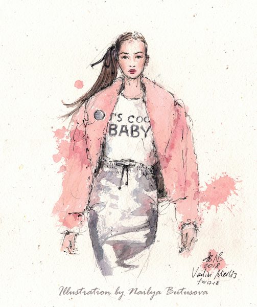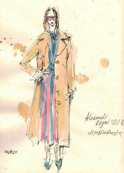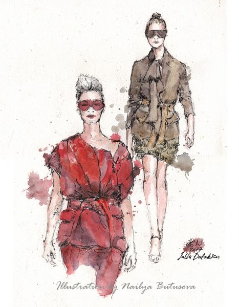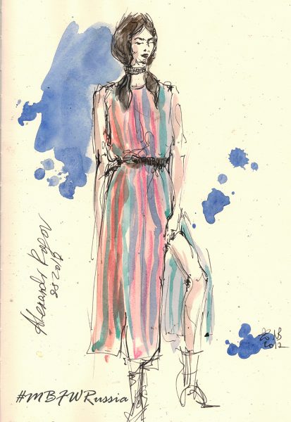 Я обязательно сама смотрю показ, ловлю каждую секунду. Иногда делаю зарисовки прямо на показе, чтобы схватить сиюминутную эмоцию за хвост, и, конечно же, снимаю на мобильный. После в мастерской переосмысливаю увиденное и дополняю эскиз. В прошлом сезоне я делала зарисовки с натуры на бэкстейдже MBFWRussia. Это было потрясающе! Конечно, зарисовки, сделанные таким образом, порой выглядят минималистично, но зато они очень эмоциональные и сделаны «здесь и сейчас».